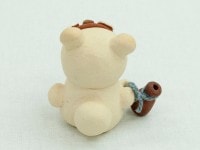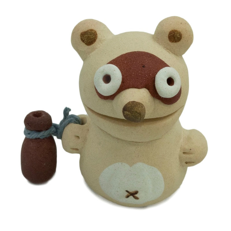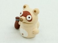 子供からご年配の方まで幅広い方々に人気がある、森のメッセンジャー達。人々を癒す、そのとぼけた表情を作るため、粘土細工と装飾が細部にまで施されています。それぞれのキャラクターが手にしている小物にもこだわり、オリジナリティーを際立たせました。こちらは片手にトックリを持った飲んべぇをイメージしたたぬきです。