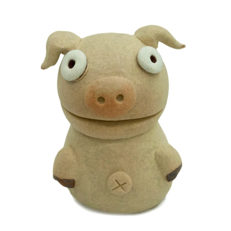 子供からご年配の方まで幅広い方々に人気がある、森のメッセンジャー達。人々を癒す、そのとぼけた表情を作るため、粘土細工と装飾が細部にまで施されています。それぞれのキャラクターが手にしている小物にもこだわり、オリジナリティーを際立たせました。こちらはクルッとしたしっぽが可愛らしい子ブタです。