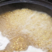 大豆は、薪をくべて大鍋でぐつぐつと約2時間煮込み、直径約20cmに丸めた味噌玉を沢山作ります。その味噌玉を、大きな樽へ投げつけて空気を抜きながら整えていきます。